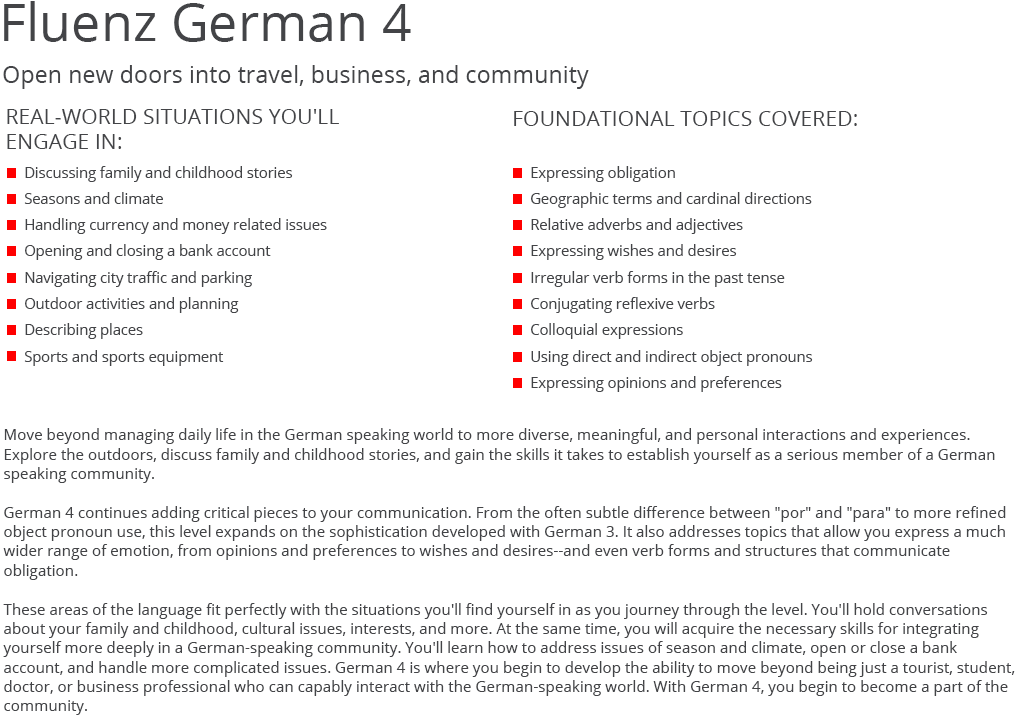 Fluenz leads learners through a unique path of basic and intermediate German designed for English-speakers...