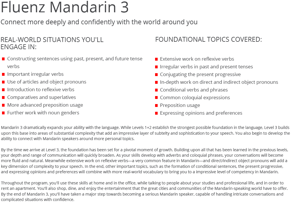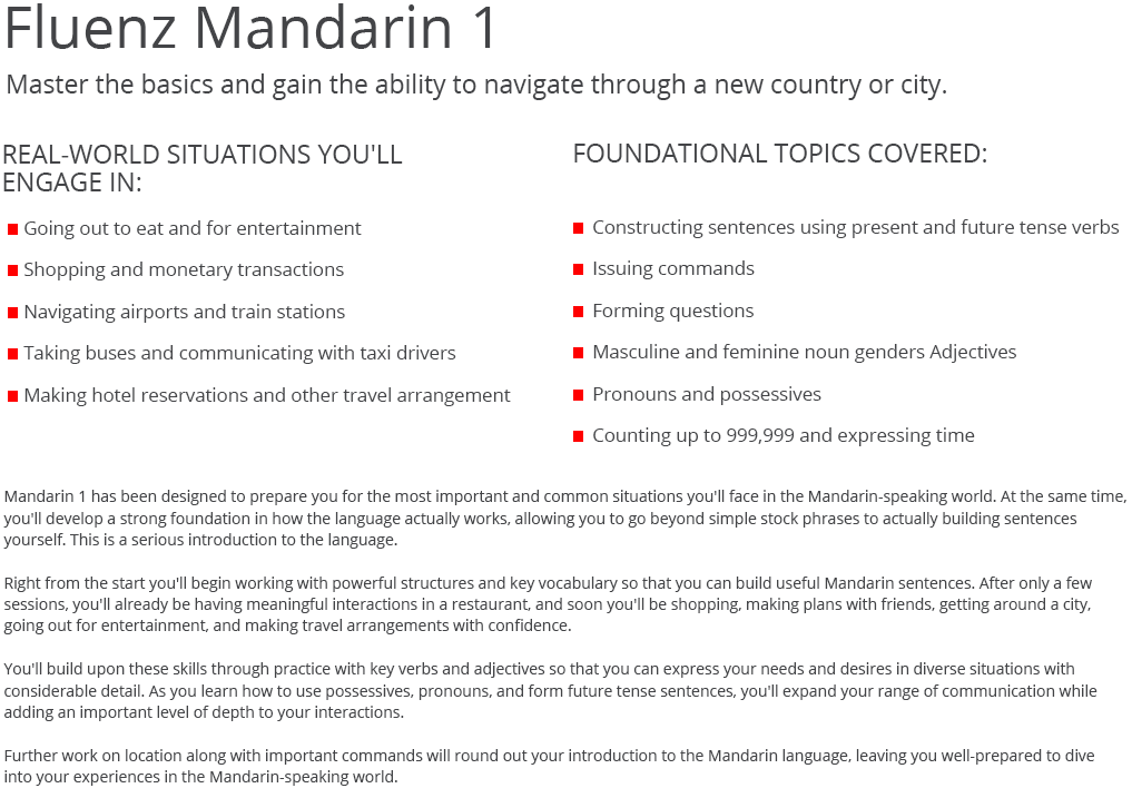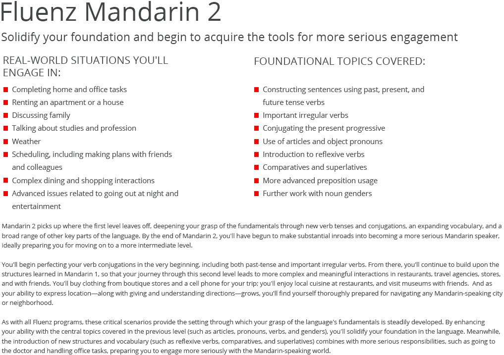 Fluenz Mandarin is the only major program that guides learners with clear video explanations of Mandarin in English tied to a comprehensive workout platform,..